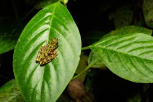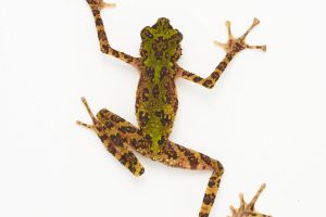 Among the species in the Genus, Ansonia latidisca is the most colorful one and a fairly large species, measuring up to 50 mm snout-vent length. The color pattern is very distinct: brown sharply delimited markings are in contrast with the green-yellowish background. Warts on the dorsum bear bright red tips.