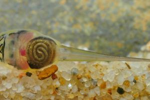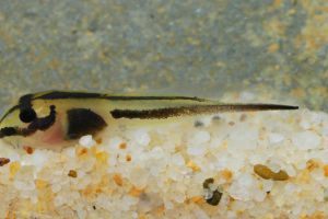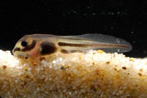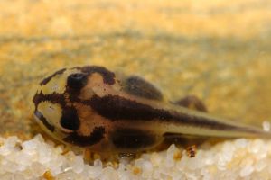 Ansonia leptopus tadpoles are very distinct. Black markings on a light background make the tadpole of this species unique. Only Ansonia longidigita larvae have such a contrasty pattern, yet in different shape.