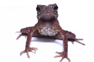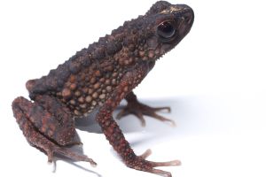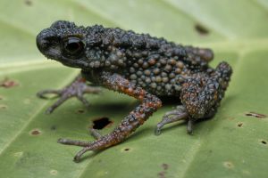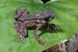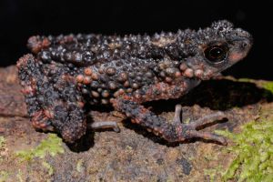 Ansonia spinulifer is a common lowland stream toad known from many places in Sarawak. Calling males can be found at night, sitting and calling from low vegetation close to streams. A. spinulifer is easy to recognise: there are big spinose warts on the dorsum and usually a light spot between the shoulders. The warts are large and have keratinized projections, giving the species its name. The base color is blackish with interspersed brown to red tones.