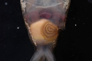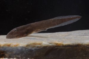 Ansonia spinulifer tadpoles show the typical sucker mouth of rheophilous Ansonia tadpoles. The mouthparts are shown on the lower image. There are double rows of submarginal papillae. The upper jaw is divided, the lower undivided. The upper lip bears two keratodont rows, the lower three; all rows undivided. The upper side is dark brown with some silver-golden dusting. Dark pigmentation extends onto the tail and the tail fin margins are also pigmented (faintly visible on the image against the black background). Note the extent of the tail fin relative to other Ansonia tadpoles.