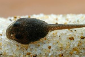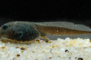 The tadpoles are small, reaching less than 25 mm in total length, and are uniformly black. In the open habitat types used by this species, their tadpoles are distinctive and unlikely to be confused with those of other frogs or toads.