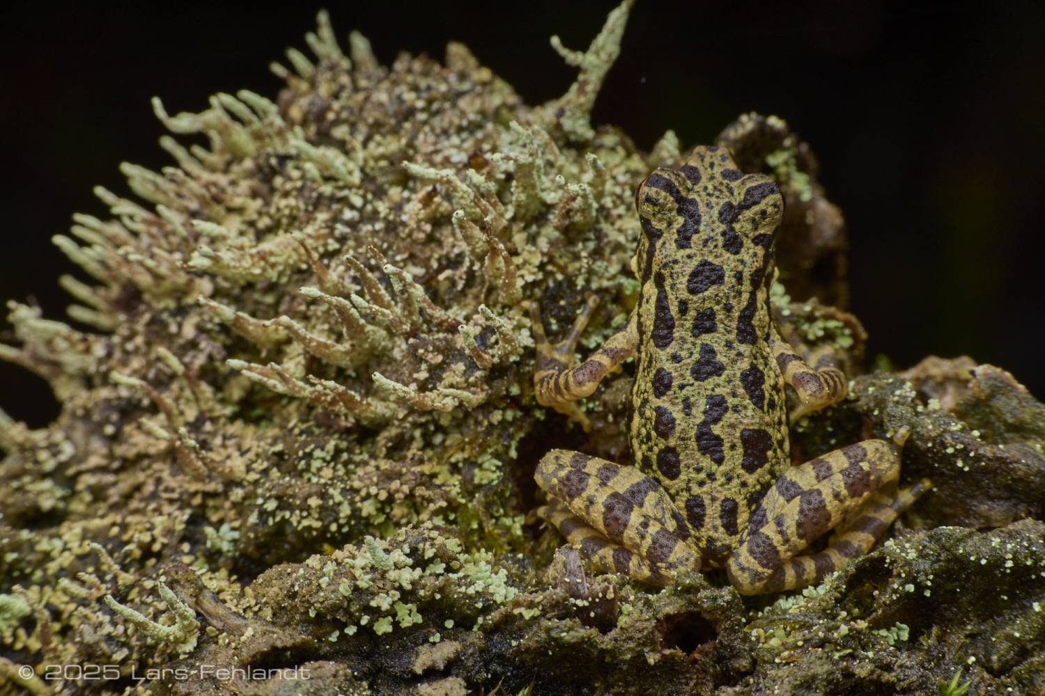 Adult males reach about 70 mm in snout–vent length, while females grow to roughly 95 mm. The snout is short and rounded in dorsal view, and appears truncated in lateral profile. The limbs and digits are moderately long. The parotoid glands are distinct and rounded. The eardrum is visible but indistinct. The fingers are long and only slightly expanded at the tips. The toes are fully webbed except for the fourth toe, which remains free at the distal end; the fleshy webbing carries the general coloration pattern. The skin is warty, and in fully grown individuals, some warts—particularly on the dorsum and upper surfaces of the hind limbs—terminate in pointed, keratinized tips.