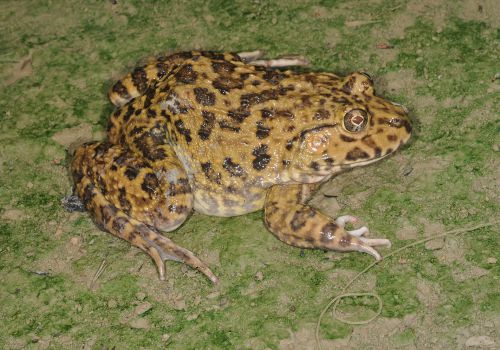 6 species have been described in the genus Hoplobatrachus (ASW). These are large and powerful frogs often harvested for food from rice paddies. The only species on Borneo, H. rugulosus, has been introduced. The natural geographic range of the genus includes Subsaharan Africa south to Angola, northeastern Zambia and Tanzania; India, Sri Lanka, Malay Peninsula, Myanmar, Thailand, and southern China.