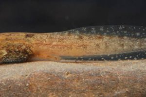 The tadpole on the image below was found in a sun-exposed side pool of a large, clear river, a situation preferred by the species (yet, identity not verified by DNA). It is a typical Limnonectes-type tadpole, insofar as it is dorsoventrally depressed and tan in color. The tail is relatively long and the tail tip is pointed. The tail fin is moderately high with whitish dots (as in other Limnonectes species). All individuals from the site had a dark marking at the trunk-tail transition.