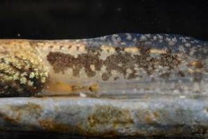 The tadpoles are dorsoventrally depressed. The tail is moderately long and the tail fins are relatively low. The fin in one specimen was damaged (dragonflies?); the tail tip appears blunt but the very tip may be missing. The muscular part of the tail bears a series of blotches. The belly is mostly unpigmented. Tadpoles of leporinus and malesianus are similar, with differences in the tail blotching and slightly different mouth keratodonts.