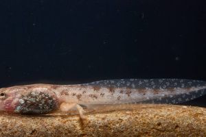 We found tadpoles in shallow puddles with sandy-silty bottom on trails, and in quiet sections of small, slow moving streams. The tadpole is moderately dorsoventrally compressed. The tail is twice the length of the trunk and the tail fin is low, giving the tadpole a slender appearance in side view. The tail tip is pointed. Tadpoles may develop a medial stripe in advanced stages.