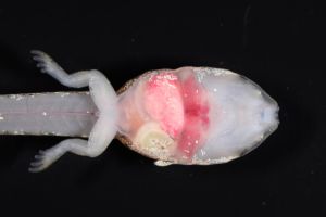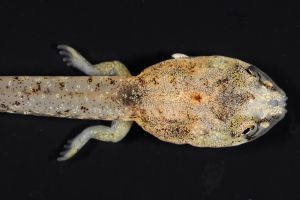 The tadpoles are predatory and ingest small invertebrates. The tail is long and the tail fin is low. The tail tip is pointed. The mouth is terminal in position and the orifice appears quite small.
