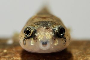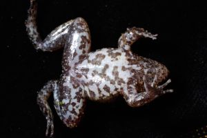 Dorsal coloration is varialble, brown, grey, or olive sometimes with dark markings. Some individuals have a vertebral stripe. The belly is cream with an abundance of brown spots. Although smaller it looks a bit more stocky in proportions than the somewhat flatter laevis.