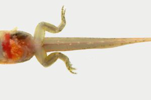 The tadpoles are predatory and ingest small invertebrates. The tail is long and the tail fin is low. The tail tip is pointed. The mouth is terminal in position and the orifice appears quite small.
