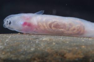 L. mjobergi prefers streams coarse gravel. Little is know about the life habits of the tadpoles, which live in the gravel interstices. We present the first image of a parva tadpole here. Maximum length of larvae has not been recorded. The larvae we caught were pre-matamorphic and had not reached maximum size.