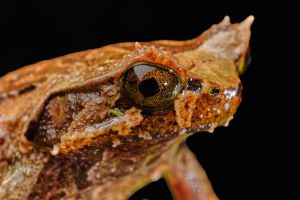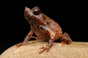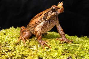 This frog is brown above with dark markings and some rows of warts on the back. It has multiple small "horns" above the eye. The snout is short, blunt and a nasal projection is absent. It lives sympatrically with Pelobatrachus kobayashii, a larger species.