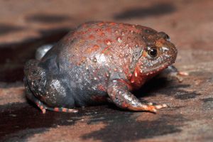 Glyphoglossus capsus is a brightly colored species of microhylid frog. It was first described by our team in 2014 from Borneo, specifically from Gunung Penrissen, Sarawak (936 m a.s.l.), and from Gunung Serapi, Matang Range, Sarawak. This species has also been referred to as the “Red Hot Chili Pepper” frog due to its distinctive coloration: the dorsum is olive to brown with numerous bright red spots, especially around wart-like structures. The underside (venter) features a striking combination of bright red along with areas of white and dark marbling.
