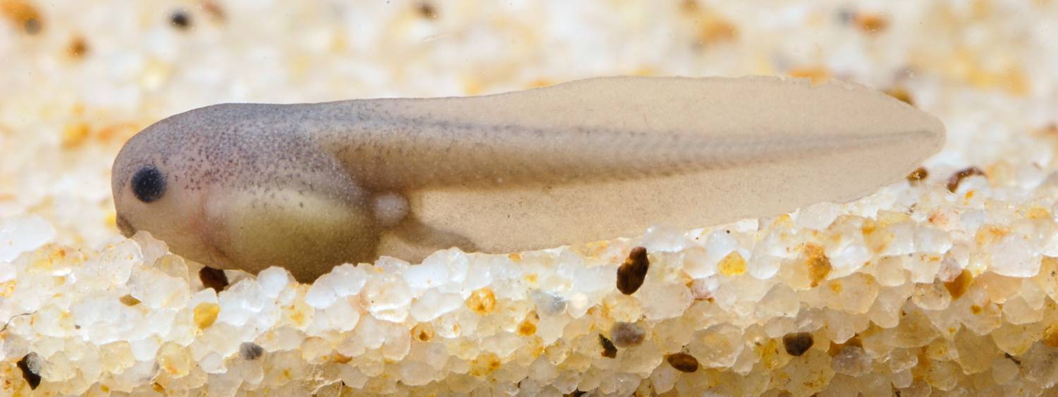 We do not have images of fully grown tadpoles. The tadpole image shows an early hatching stage, still bearing adhesion glands. Interestingly, a limb bud is well developed at this early stage. The early-stage specimen was identified by DNA matching.