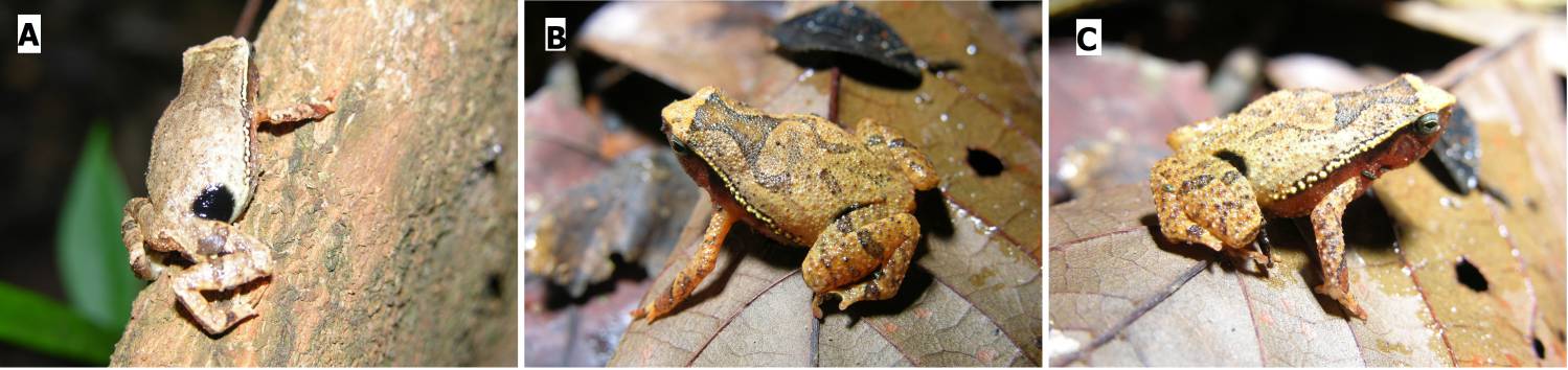 The upper body is tan to beige, with its appearance varying depending on environmental conditions. The underside is lighter than the dorsum. Overall, the species is well camouflaged, closely resembling dead leaves and blending effectively into the leaf litter. A thick, X-shaped marking of darker pigmentation is present across the shoulders. Along the sides, a conspicuous dorsolateral row of white tubercles edged in black is visible. The throat usually bears an irregular pair of dark longitudinal bands. The chest and abdomen are marked with small, irregular black spots or dots, while the ventral surfaces of the limbs have a few scattered black dots. As prominent features, a large black inguinal blotch is present and the posterior faces of the thighs is with or without one to four black rimmed light spots.
