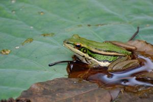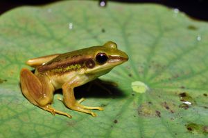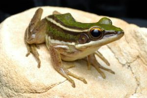 Hylarana erythraea is a commensal species. It benefits from human activities and is abundant in agricultural areas, ditches along roads, irrigation ponds, and similar habitats. It is unlikely to be confused with other species.