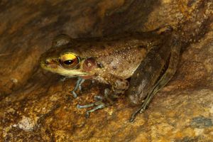 In life, the back is olive-brown with dark spots. A faint dark marking is present below the canthus on each side of the snout. The upper lip is light brown with a few darker spots. The iris is a uniform golden color (Fig. 3A). A blackish-brown band surrounds the eardrum, which itself is dark brown with a lighter center. The limbs show alternating light and dark brown crossbars, with the darker bars noticeably wider. The rear of the thighs is dark brown, mottled with irregular light spots. The lower lips have faint light-brown barring. The throat, chest, and belly are whitish, except for the vocal sac, which is light brown (Fig. 1B). The undersides of the legs are slightly darker but lack any black pigment dots, and the toe webs are blackish-brown.