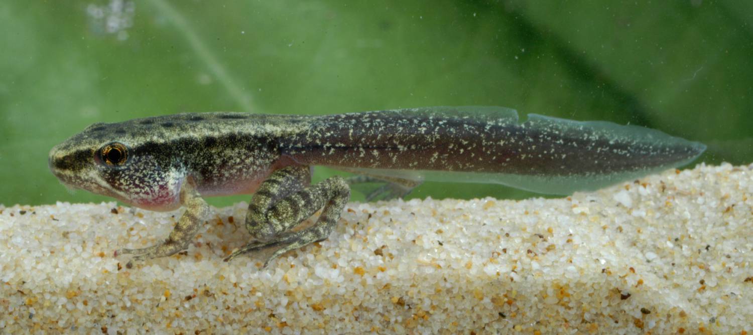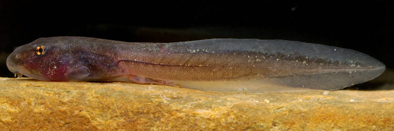 The tadpoles are dark gray in coloration. The tail fin is moderately high and the tail itself is long. The fin lacks any skin glands. The iris is golden (not red), a feature that distinguishes them from the superficially similar tadpoles of Hylarana signata and H. picturata, which may occur in the same microhabitats. Tadpoles of O. hosii are usually found in quiet side-pools of rocky streams, typically deeper than 50 cm, with thick accumulations of leaf litter and plant debris at the bottom.