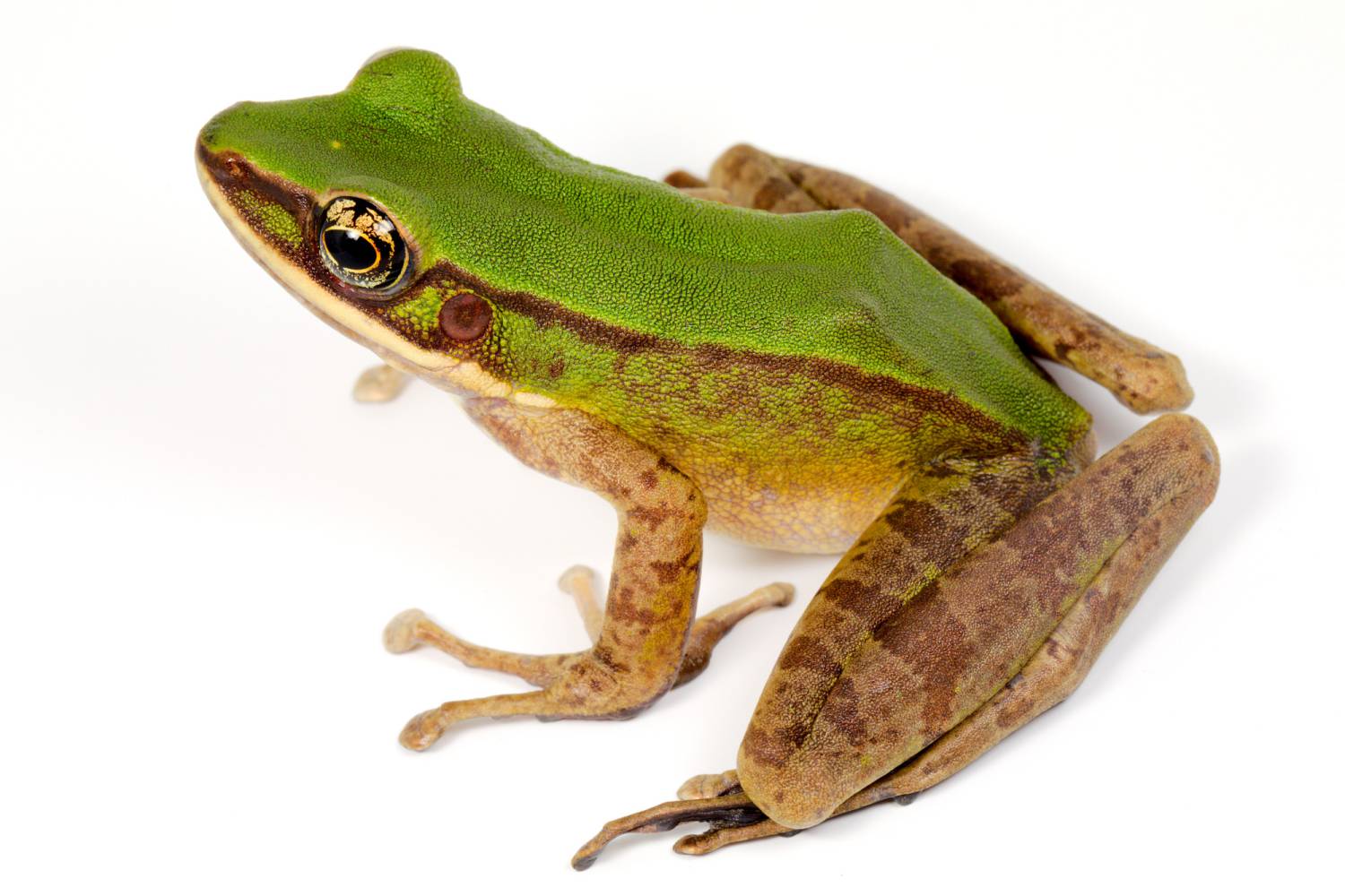 The dorsal surface is green, while the flanks and legs may be either green or brown. The upper lip is white to cream-colored and extends as a streak toward the region above the forelimb insertion. The limbs bear dark cross-bars. The chest and belly are white, and the eardrum is clearly visible.