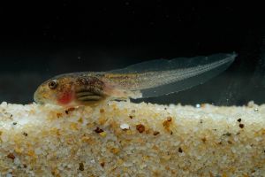 The tadpoles of this species are small, they grow up to only 25 mm total length. In size and general body shape they resemble a bufonid tadpole, but differ from bufonids in mouthpart keratodont rows. The generalist type tadpoles live in stagnant water. The tail tip is moderately pointed. The iris has a coppery hue.