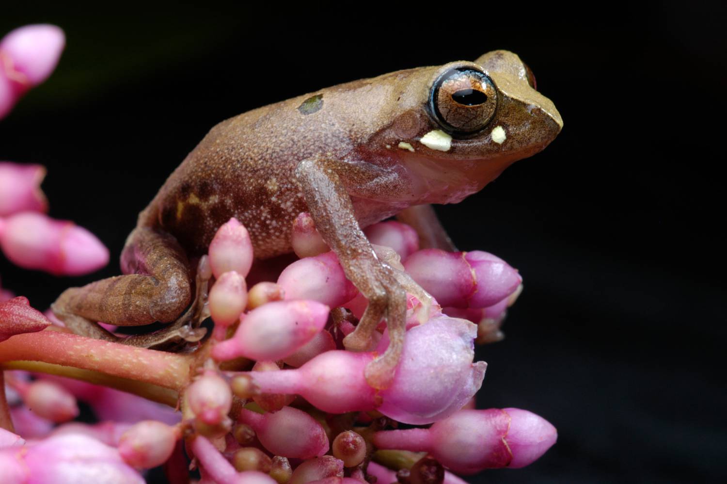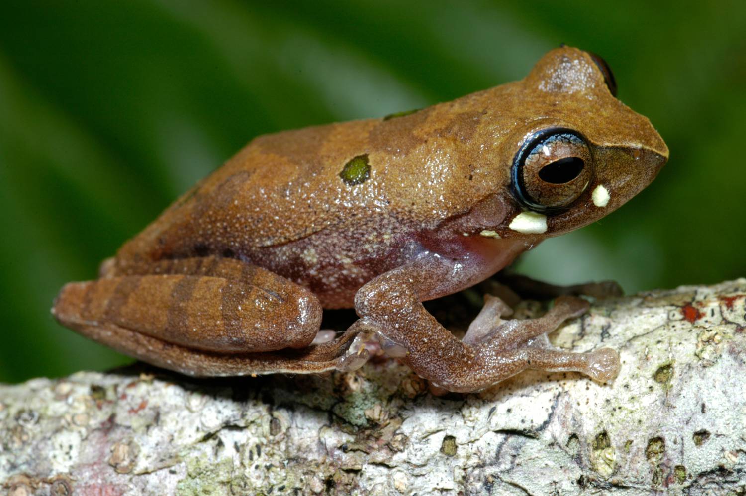 Males reach up to about 35 mm in snout–vent length, while females grow to around 50 mm. The body is moderately robust in males and more so in females. The fingers and toes end in large, round adhesive disks, especially prominent in females, which make these frogs excellent climbers. The angled snout connects to the eye via a sharp canthus. Webbing is present not only on the toes but also at the base of the fingers. The dorsal skin is smooth and lacks tubercles or warts, while the ventral skin is finely granular. Males are typically brown above, whereas females are green. The lower flanks may be yellowish, with dark speckling or marbling. In some populations, one or two bright white spots may be present on the upper lip. Typically the iris is coppery red around the pupil and bluish in the uppermost part.