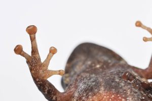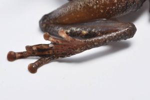 The fingers and toes bear expanded terminal adhesive disks. The free portions of the digits are fringed with fleshy ridges. Webbing is very reduced between the fingers and only moderately developed between the toes. The dorsal skin bears scattered small, round tubercles, with some larger tubercles arranged in a line from behind the eye to the mid-body. Additional tubercles are present on the flanks and eyelids. A distinct supratympanic fold extends from the eye to the arm. The ventral skin is coarsely granular.