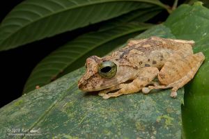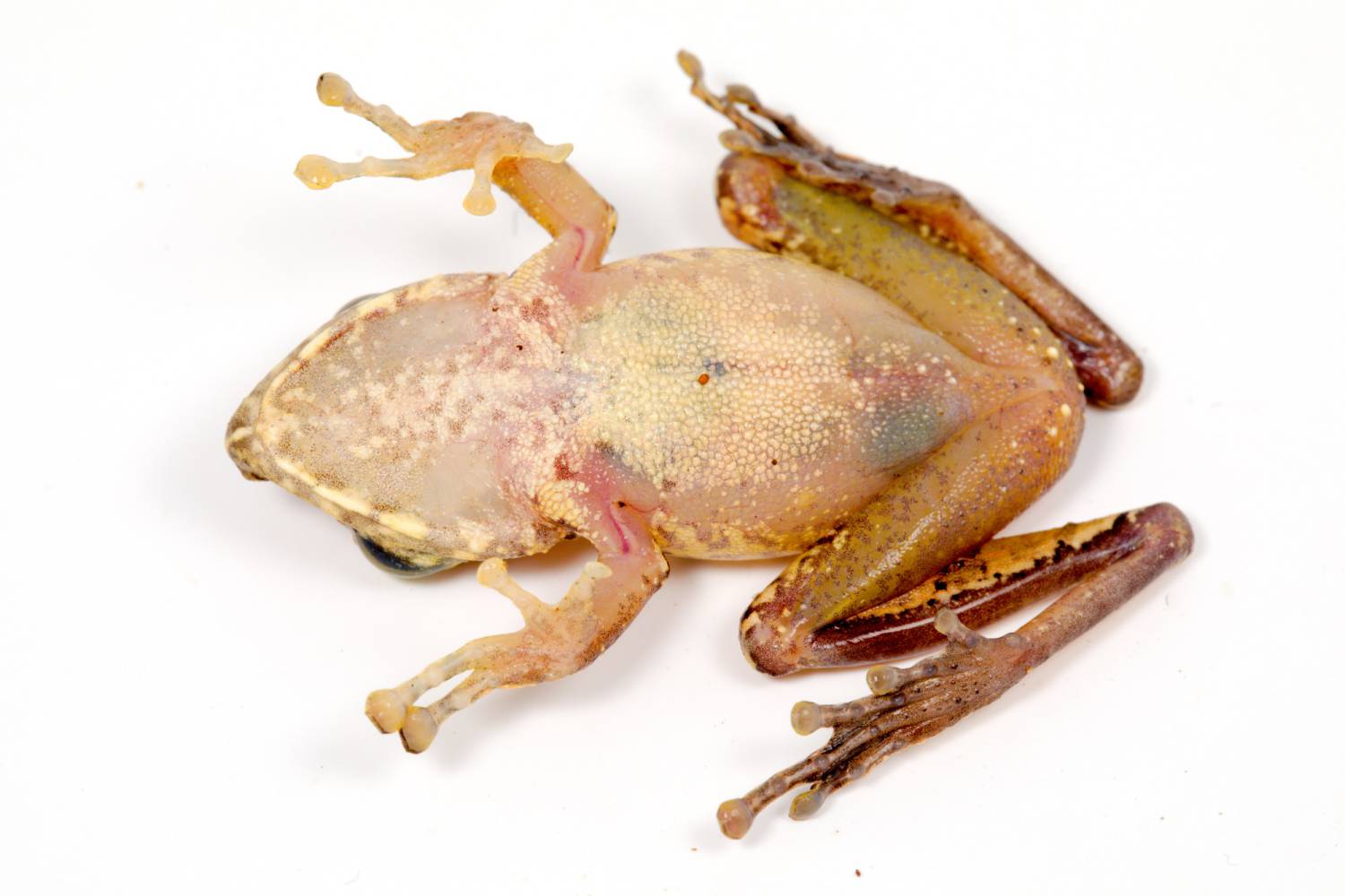 It is a medium-sized species: males reach up to 49 mm and females up to 63 mm in snout–vent length (SVL). The snout is relatively long and sharply pointed. Fingers and toes end in large adhesive discs; the toes are almost fully webbed, whereas the fingers have only rudimentary webbing. The dorsal skin is finely granular or pebbled, and some slightly enlarged tubercles may be present on top of the eyes and along both sides in a line across the upper shoulder region, forming an open V. The eardrum (tympanum) is visible, though indistinct from the surrounding skin. A curved supratympanic fold runs from the eye to the arm. The heels lack calcar spurs.