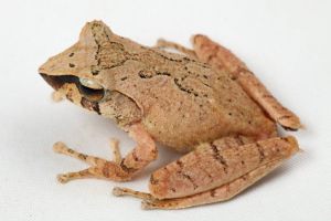 The sharp-edged nose, color pattern of the iris, and the dark band between eye and nose make this an easy to identify frog.