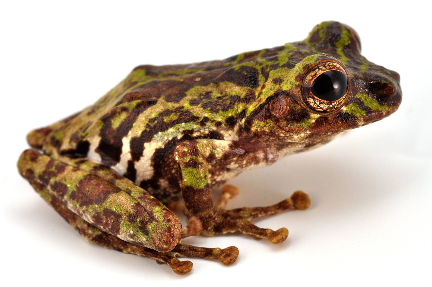 Dorsal coloration is typically green with extensive brown markings, sometimes forming an X on the dorsum. The lower flanks are white with dark brown markings that often form a striped pattern. In some individuals, the groin and armpit regions are tinged with reddish hues. The iris has a bronze background with a conspicuous dark reticulation, and the pupil is bordered by a thin orange ring.