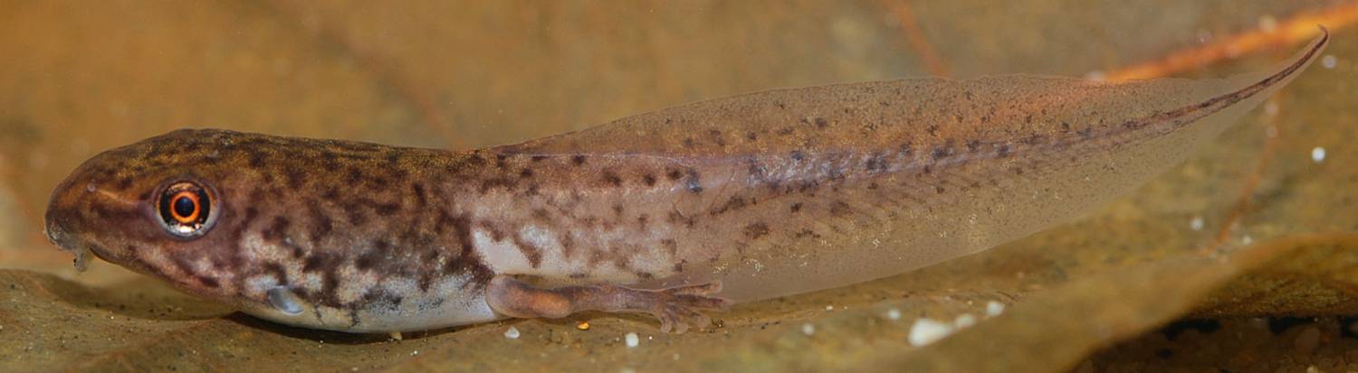 Tadpoles have a unique marbled pattern on head, trunk, and tail. The iris rim is red. The tail terminates in a thin flagellum. Tadpoles grow up to 33 mm total length.