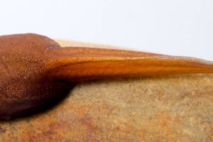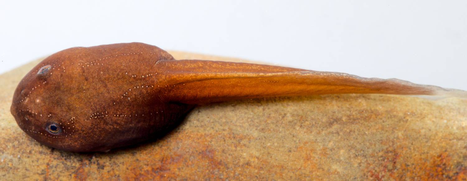 Tadpoles grow large, exceeding 60 mm in total length. The head and trunk are broad and massive. The tail comprises roughly two thirds of the total length and ends bluntly. Tadpoles are brown dorsally, lacking conspicuous patterning, while the belly is greyish and opaque.