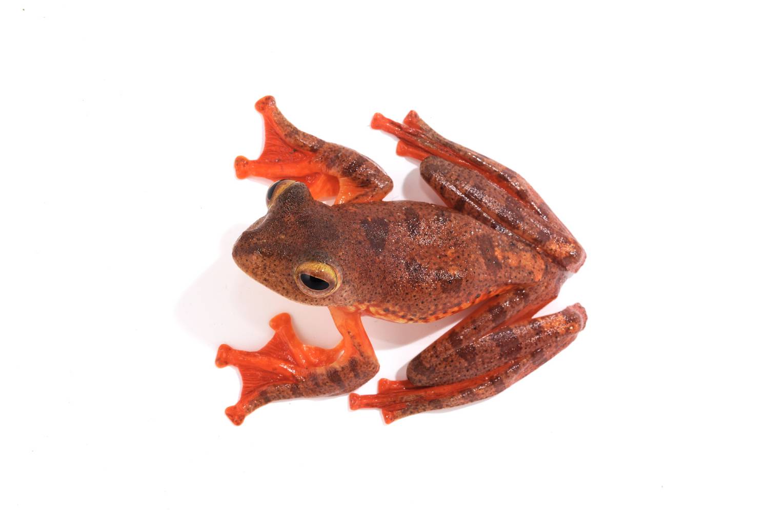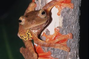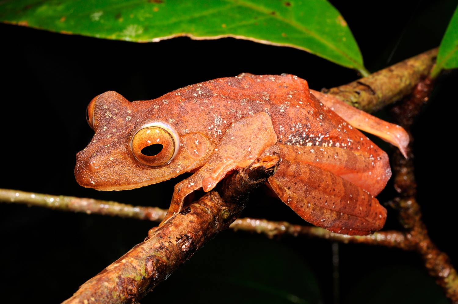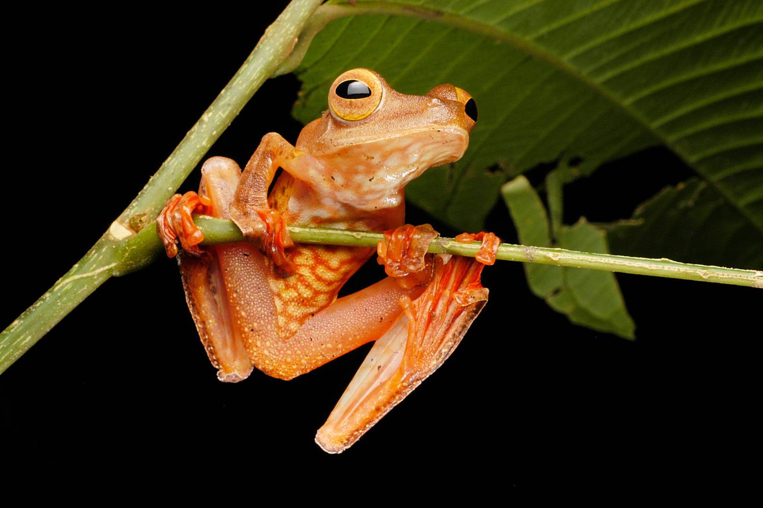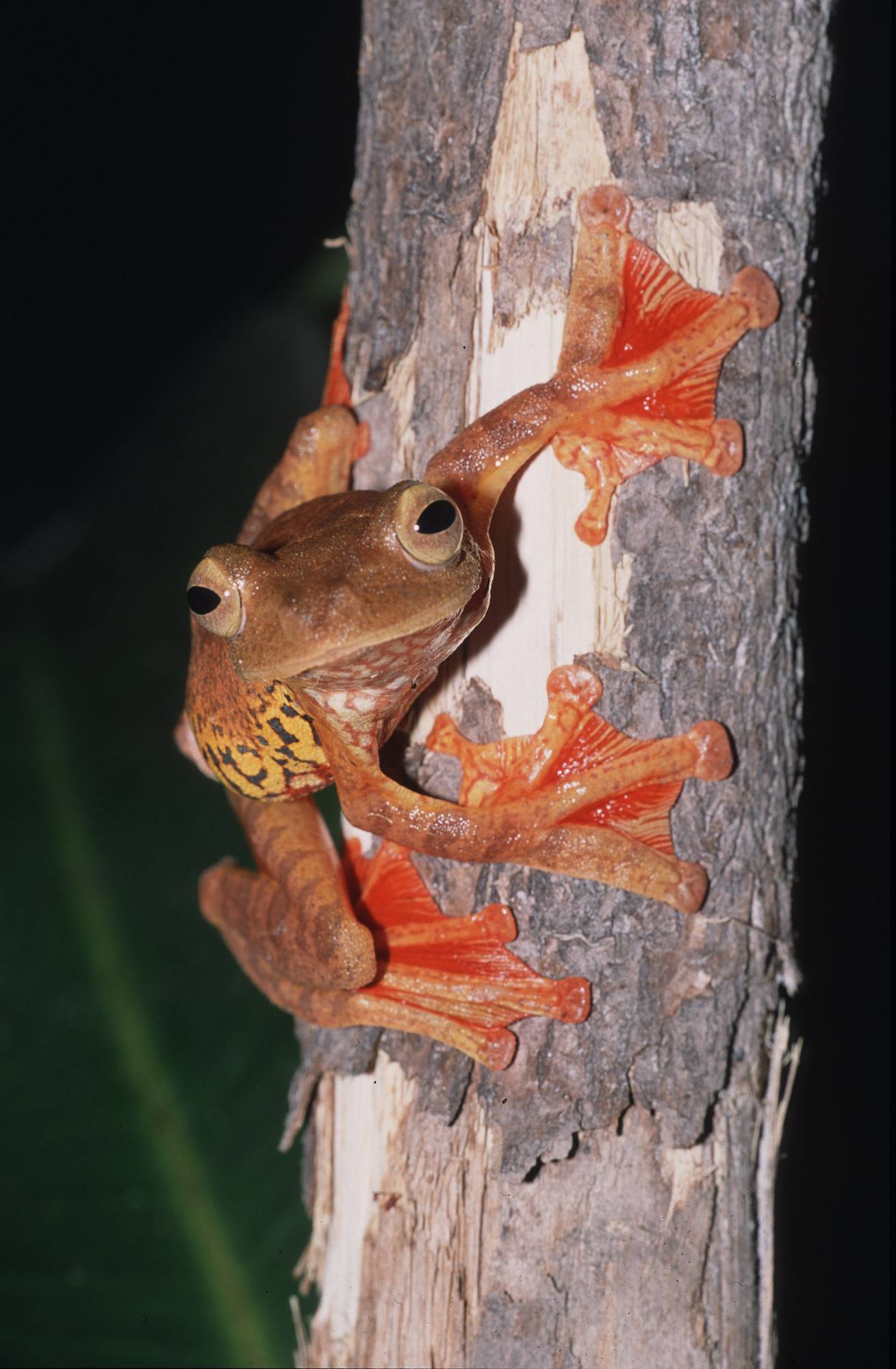 Rhacophorus pardalis is the “flying frog” most likely to be encountered by naturalists in primary and old secondary forests throughout much of Borneo. Of course, it is a glider rather than a true flier. Its moderately large size, bright red hand and foot webbing, and yellow flanks patterned with black dots make this species easy to identify. Beyond Borneo, its range includes Peninsular Thailand, Peninsular Malaysia, Sumatra, and the Philippines.
