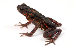 Ansonia spinulifer is a common lowland stream toad known from many places in Sarawak. Calling males can be found at night, sitting and calling from low vegetation close to streams. A. spinulifer is easy to recognise: there are big spinose warts on the dorsum and usually a light spot between the shoulders. The warts are large and have keratinized projections, giving the species its name. The base color is blackish with interspersed brown to red tones.