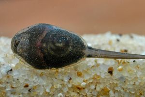 The tadpoles are small, reaching less than 25 mm in total length, and are uniformly black. In the open habitat types used by this species, their tadpoles are distinctive and unlikely to be confused with those of other frogs or toads.