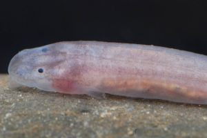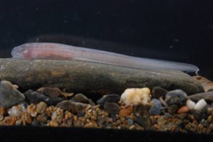 Its snout is longer and the head more dorsoventrally flattened than in mjobergi larvae.