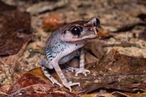 The species is brown to gray above with darker dorsolateral spots; the coloration is optimised for camouflage in the leaf litter. A striking features is the red, orange or yellow iris of this species. Like other species in the genus, they are opportunistic predators. They feed on various invertebrates available on the ground layer. Due to the relatively broad head, they are able to engulf larger prey items, such as cockroaches or even possibly smaller frogs.