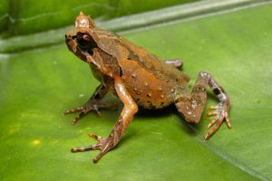 This frog is brown above with dark markings and some rows of warts on the back. It has multiple small "horns" above the eye. The snout is short, blunt and a nasal projection is absent. It lives sympatrically with Pelobatrachus kobayashii, a larger species.
