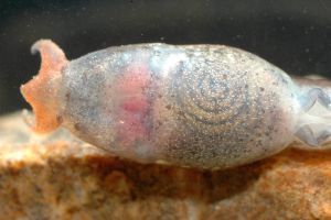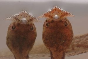The mouth labia are enlarged and form a funnel. In resting position it is slightly folded and the corners point upwards. When the tadpoles swims up to the water surface, the funnel spreads out and is used as a structure that channels water with small particles (pollen, durst, bacteria) to the mouth. The small particles are filtered from the water in the gill chamber.