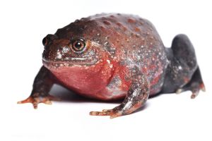In terms of coloration, the upper body (dorsum) is greyish or olive-brown with red spots, while the underside (venter) features a large red area covering the throat, chest, and part of the belly. The posterior part of the belly has white patches.