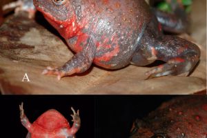 Glyphoglossus capsus is a brightly colored species of microhylid frog. It was first described by our team in 2014 from Borneo, specifically from Gunung Penrissen, Sarawak (936 m a.s.l.), and from Gunung Serapi, Matang Range, Sarawak. This species has also been referred to as the “Red Hot Chili Pepper” frog due to its distinctive coloration: the dorsum is olive to brown with numerous bright red spots, especially around wart-like structures. The underside (venter) features a striking combination of bright red along with areas of white and dark marbling.