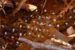 Glyphoglossus species are among the most enigmatic frogs of Borneo because they spend most of their time underground. Occasionally, under the right weather conditions, adults of G. flavus may suddenly appear in large numbers to breed explosively. A clutch was photographed by Maximilian Dehling. The photo shows a single-layer egg mass floating on the water surface, containing relatively small, light-grey embryos. Surface-floating, single-layered egg masses are common among microhylid species in general.