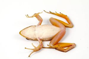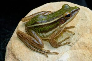 The toe and finger tips are slightly expanded. The eardrum is often (but not always) reddish-brown, sometimes with or without a green central spot. The underside lacks darker markings. The throat, chest, and belly are white to cream, whereas the limbs tend to have a fleshy or orange tint.