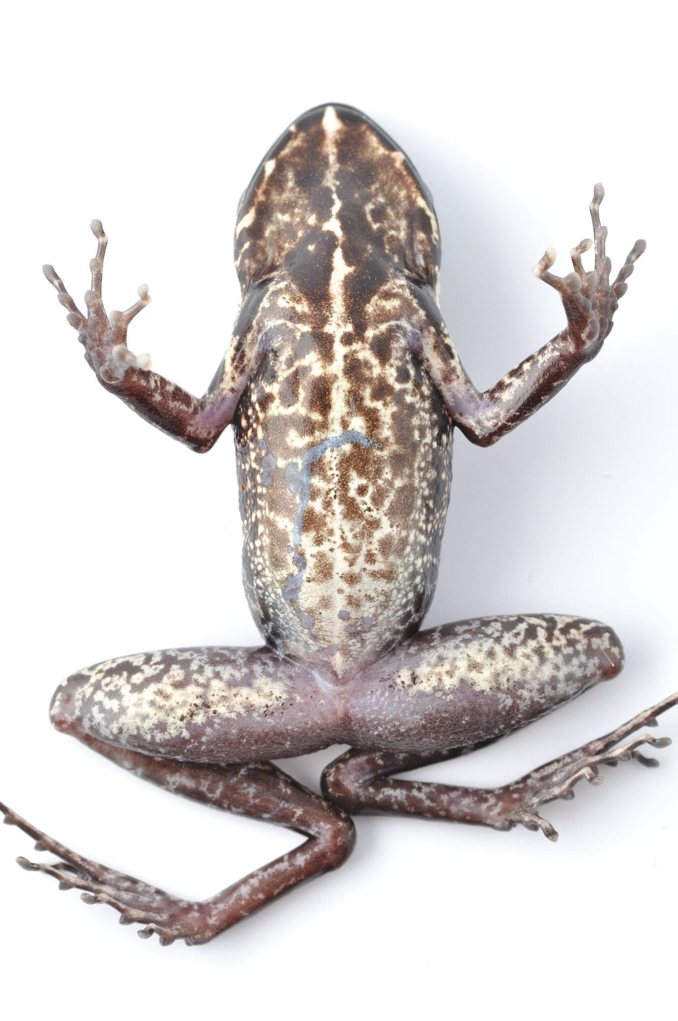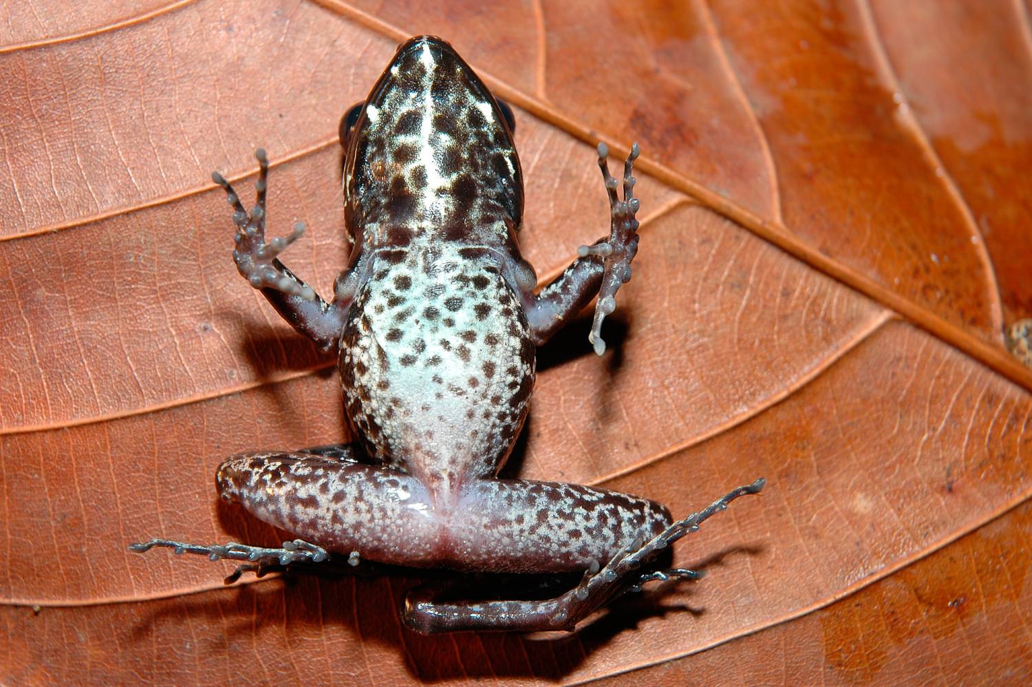Little is known about natural history of this frog, probably because it inhabits hard-to-access, swampy habitats. Additionally, it is an excellent jumper and escapes quickly when approached. Egg masses have not yet been documented. Tadpoles, however, have only recently been discovered by Dr. Tzi Ming Leong. The tadpole is highly specialized; it lives in thick leaf litter accumulations in forest swamps. It is very slender, with patches of skin glands and a highly vascularized body (resulting of a reddish skin hue in living specimens). The eyes are small. Due to their shy nature, the tadpoles are difficult to find and catch or even observe in the first place. We thank Nick Baker for the tadpole photograph.