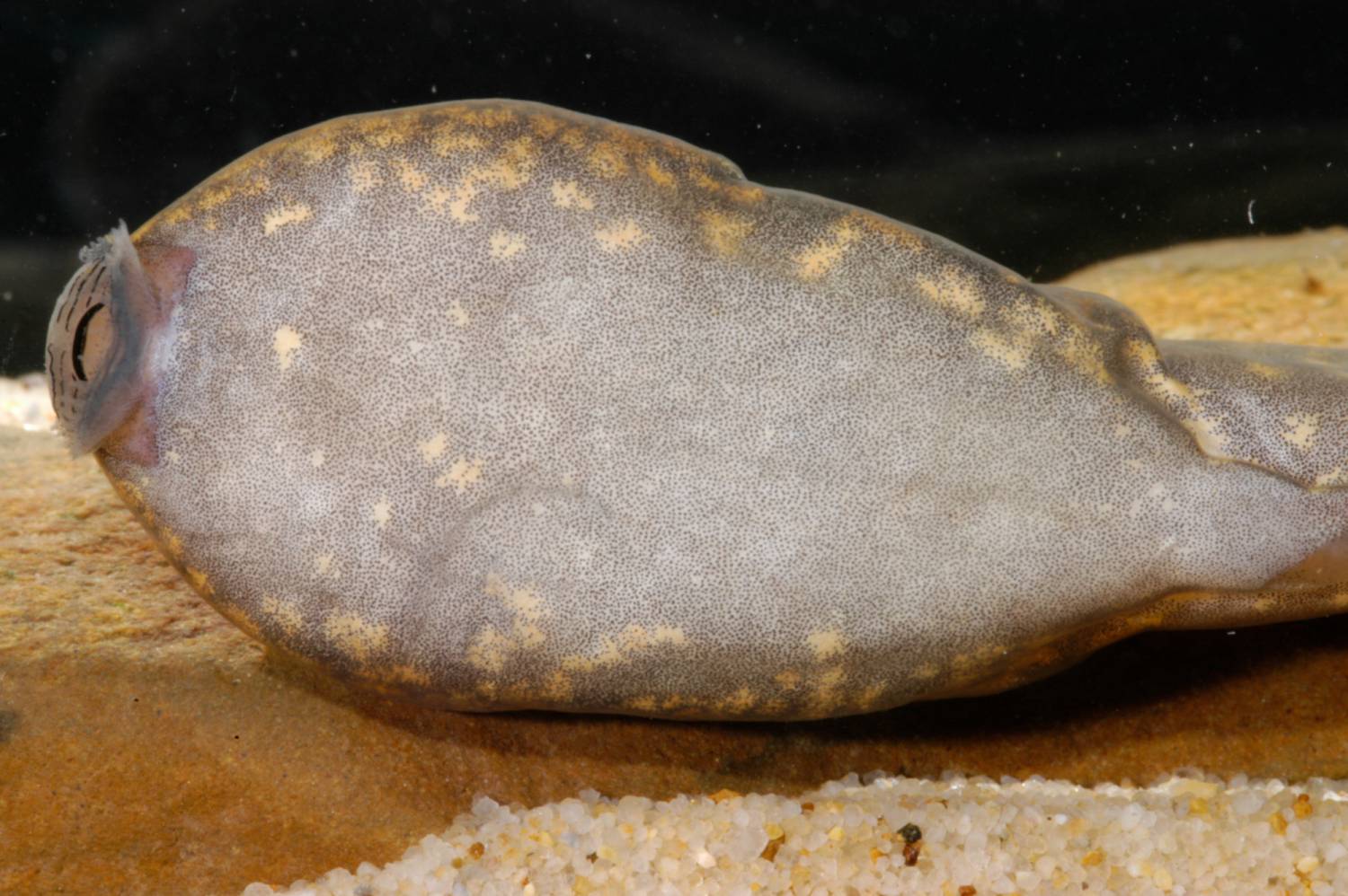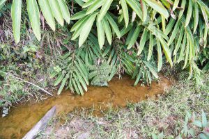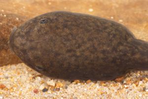 Males call from the edges of forest pools, typically hidden beneath leaf litter or from small cavities in the mud. The species appears to prefer ponds deeper than 30 cm, though it has also been reported from shallower temporary sites such as pig wallows or ditches along dirt roads. Tadpoles have been found in nearly stagnant sections of slow-moving streams or intermittent forest streams. The advertisement call is a single note that rises in frequency. Details of egg deposition remain unknown. The tadpoles grow remarkably large (> 60 mm total length) and are robust swimmers; many show signs of surviving attacks by dragonfly larvae, such as scars or regenerated tail tips.