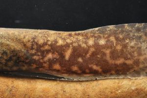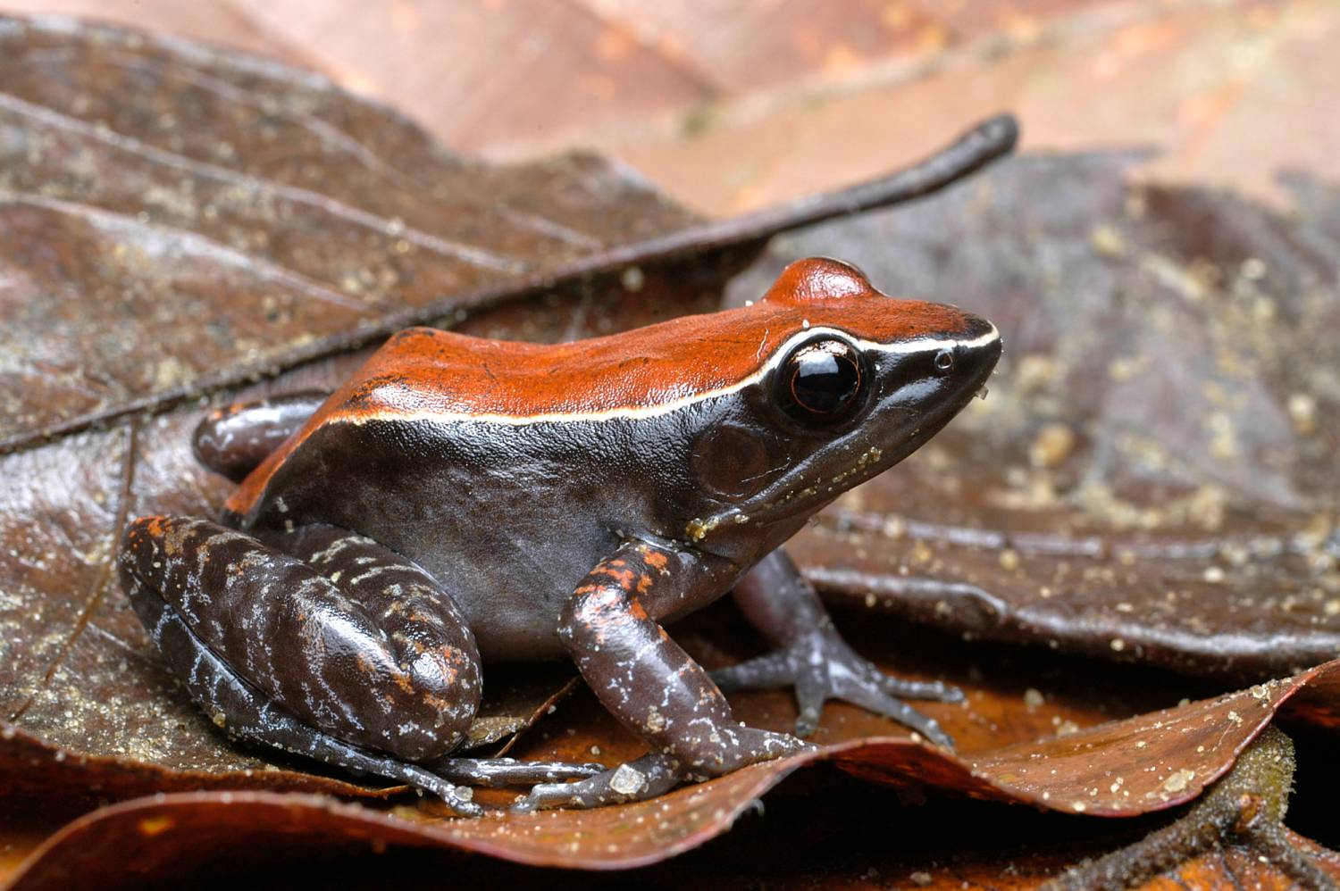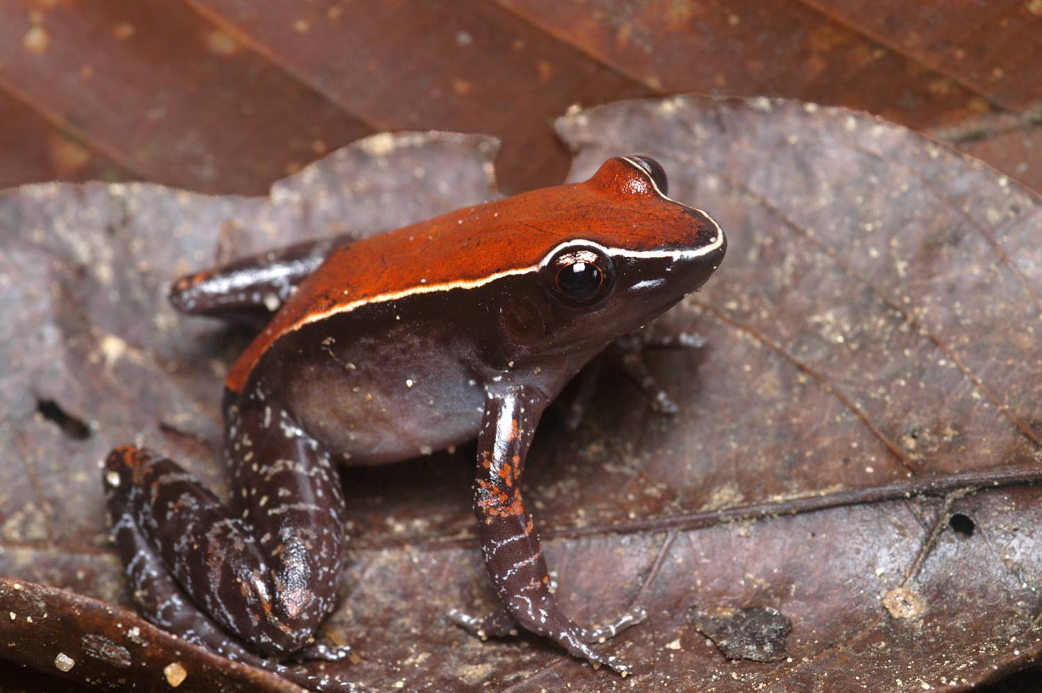 Hylarana (Abavorana) luctuosa is a striking frog that appears vividly colored against a uniform background, yet becomes almost invisible when resting in its preferred microhabitat—the leaf litter. The species was first described from Sarawak and is widely distributed across Borneo, Sumatra, Peninsular Malaysia, and Thailand. It was long considered a single, widespread species until H. decorata was resurrected and recognized as a closely related, partly sympatric species in Borneo. (See the account of H. decorata for further details.) We have encountered H. luctuosa primarily in lowland mixed dipterocarp forest, but also in kerangas patches.