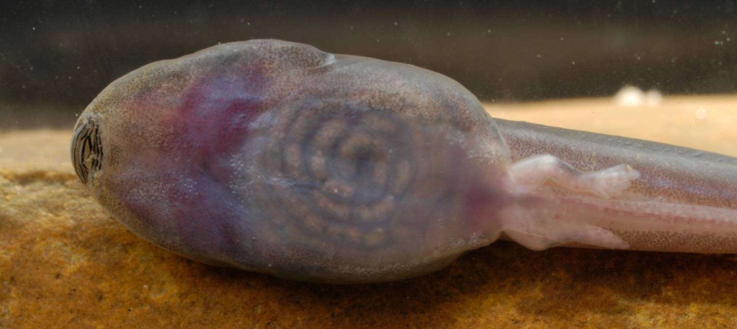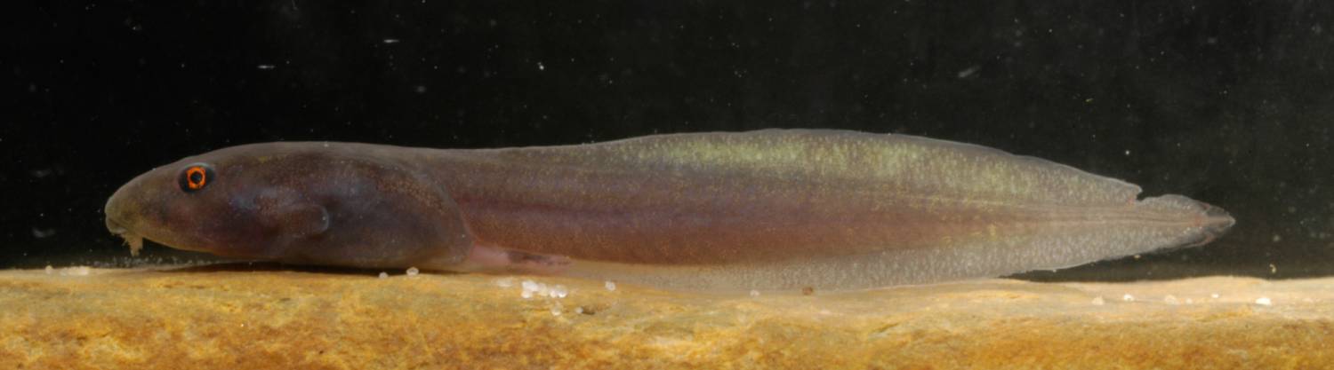 The tadpoles are black with a bluish sheen. They have moderately high tail fins and long tails. The fins are covered with numerous skin glands that become visible under favourable lighting. The iris features a distinct red ring around the pupil. The tadpoles are very similar to those of H. signata; distinguishing features still need to be established. Tadpoles inhabit stagnant or slow-moving water and are often found in streamside pools containing accumulations of leaf litter. They specialize in using the spaces within piles of submerged leaves, where they remain concealed during the day. At night, they may emerge to the surface, at which time their coloration becomes noticeably paler.
