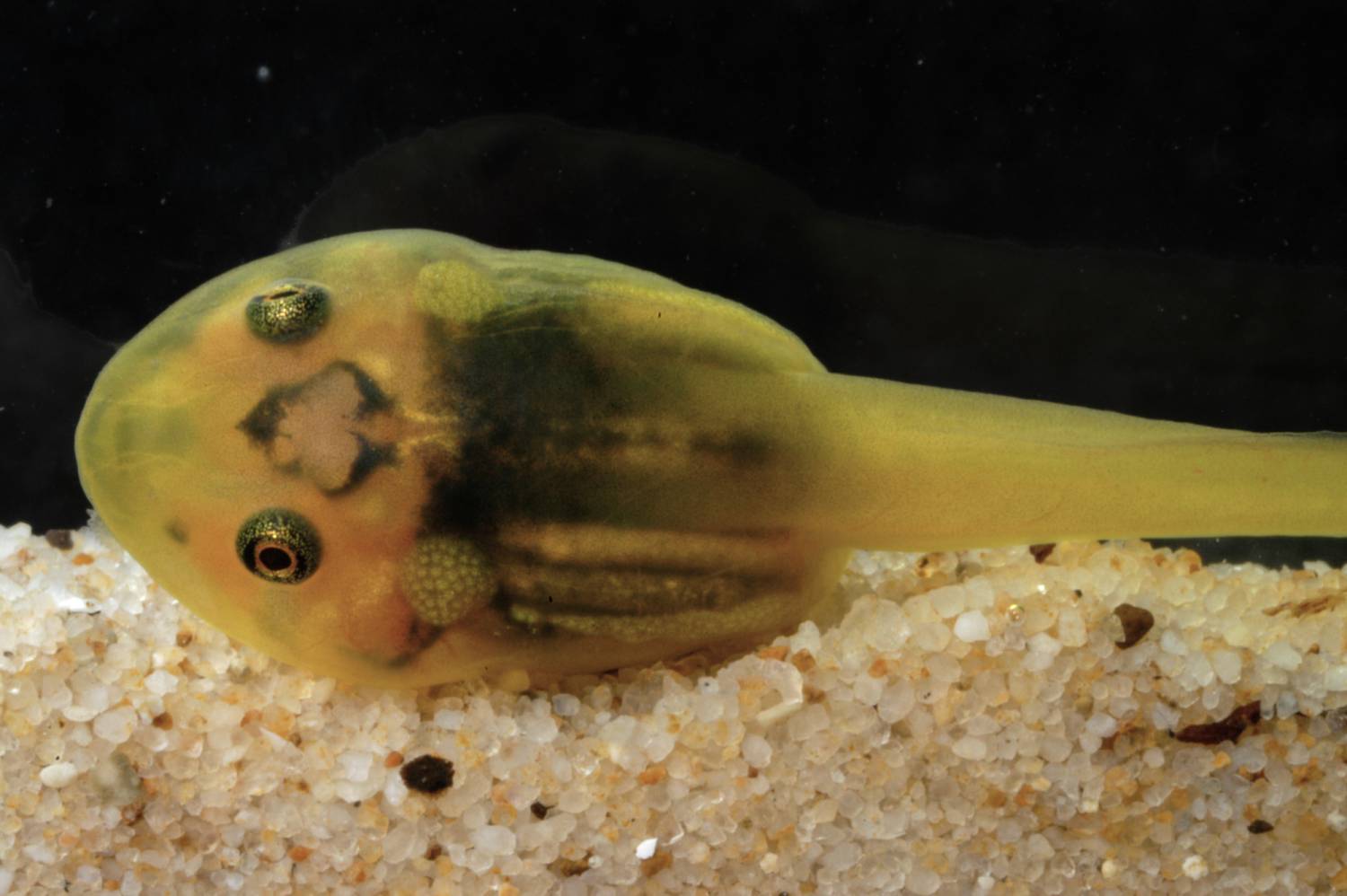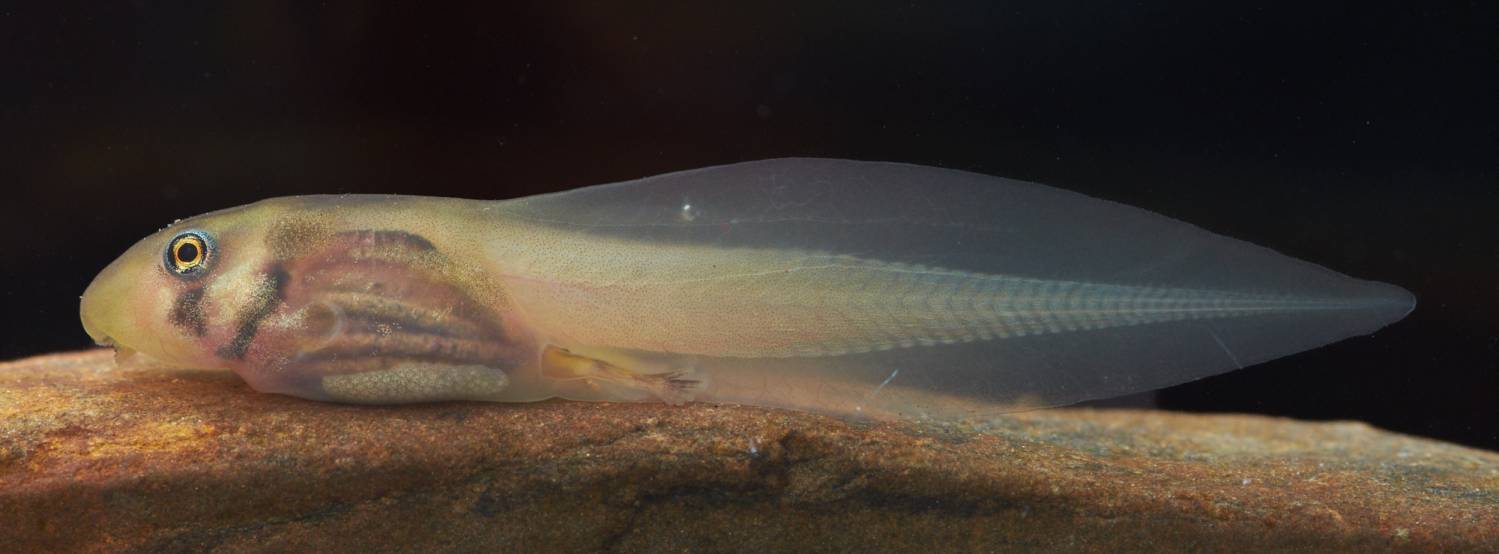 The tadpoles are conspicuous, with dark markings and bright red gills on a light brown to yellow background. They are unusually bold, often visible even during the day. The tadpoles are presumably toxic, as suggested by patches of specialized skin glands. Tadpoles of H. megalonesa are very similar in appearance, and distinguishing features between the two species’ larvae have not yet been reliably established.