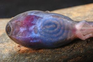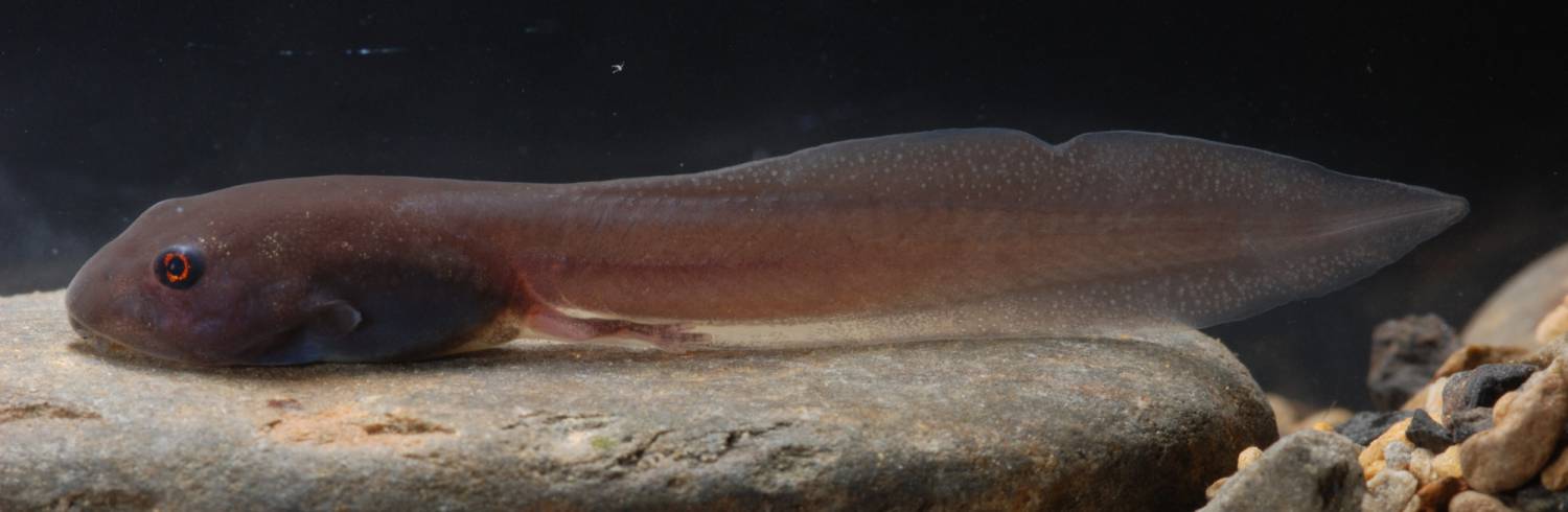 Tadpoles are black with a bluish shimmer. They have moderately high tail fins and long tails, with numerous skin glands visible under appropriate lighting. The iris shows a distinct red ring around the pupil. Tadpoles inhabit stagnant or slow-moving water and are commonly found in streamside pools or quiet bays containing accumulations of leaf litter. They specialize in using the spaces within submerged leaf packs, hiding during the day and occasionally surfacing at night. At night, their coloration becomes noticeably paler.