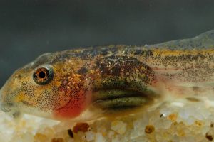 The tadpoles of this species are small, they grow up to only 25 mm total length. In size and general body shape they resemble a bufonid tadpole, but differ from bufonids in mouthpart keratodont rows. The generalist type tadpoles live in stagnant water. The tail tip is moderately pointed. The iris has a coppery hue.