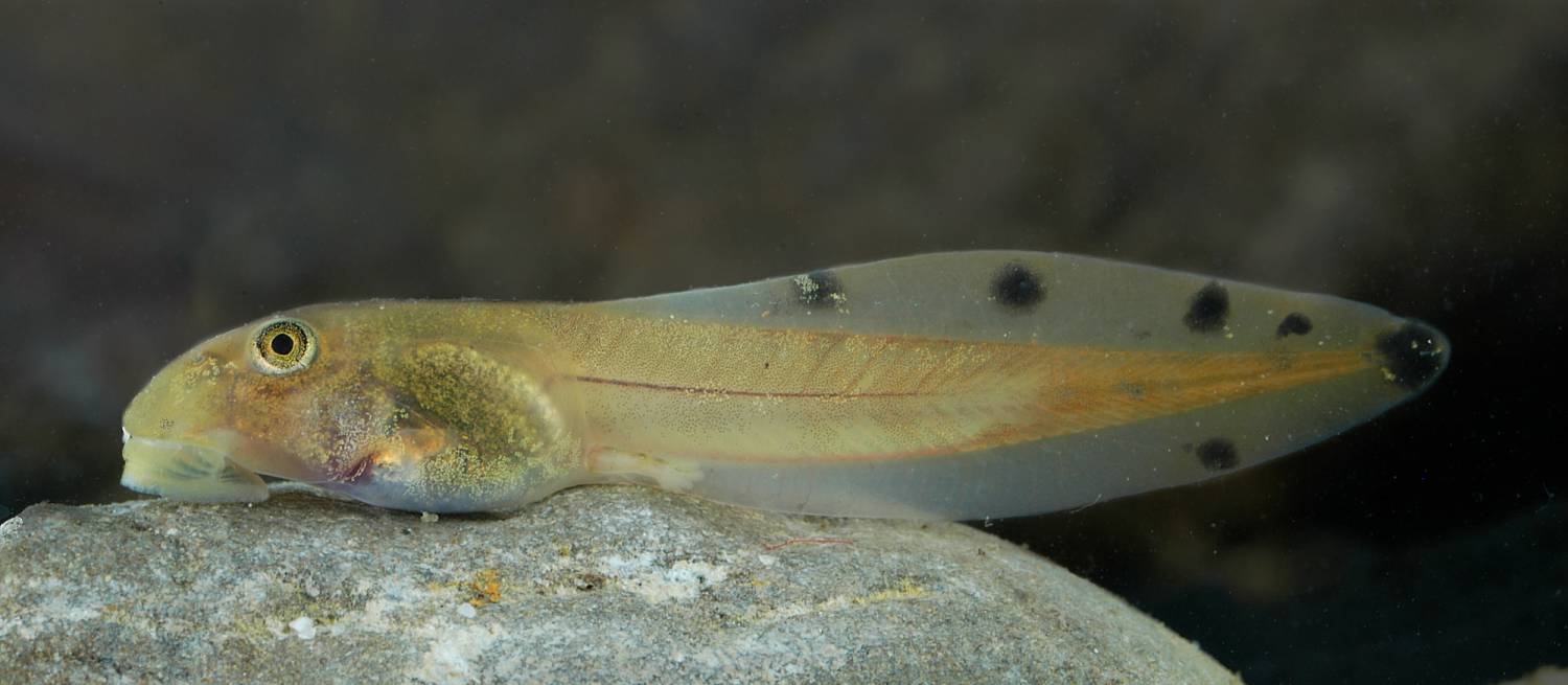 The tadpoles of this species reach a total length of up to 50 mm. They possess a cup-shaped suctorial mouth and can be distinguished by a few characteristic black spots on the tail, which they share with the tadpoles of L. penanorum. Tadpoles inhabit clear, cool mountain streams, where they use their mouth sucker to cling to rocks. They likely feed on algal and bacterial growth on rock surfaces. As with the adults, the tadpoles are more frequently observed at night.