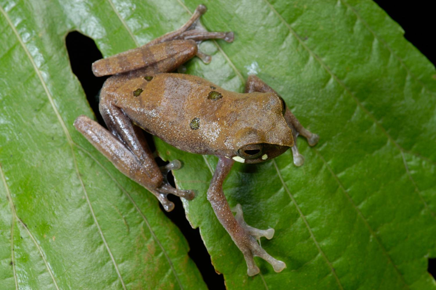 Males reach up to about 35 mm in snout–vent length, while females grow to around 50 mm. The body is moderately robust in males and more so in females. The fingers and toes end in large, round adhesive disks, especially prominent in females, which make these frogs excellent climbers. The angled snout connects to the eye via a sharp canthus. Webbing is present not only on the toes but also at the base of the fingers. The dorsal skin is smooth and lacks tubercles or warts, while the ventral skin is finely granular. Males are typically brown above, whereas females are green. The lower flanks may be yellowish, with dark speckling or marbling. In some populations, one or two bright white spots may be present on the upper lip. Typically the iris is coppery red around the pupil and bluish in the uppermost part.